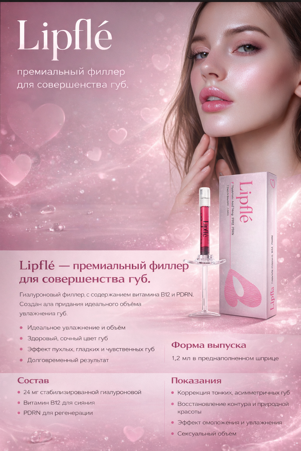 Lipflé разработан для создания естественного объёма, выраженного контура и глубокого увлажнения губ. Монофазная структура филлера обеспечивает мягкое распределение в тканях, высокую пластичность и предсказуемый эстетический результат. Формула усилена витамином B12 и PDRN, что дополнительно поддерживает регенерацию и улучшает качество кожи губ.